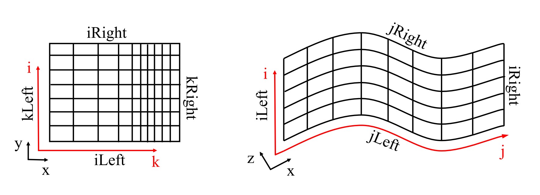 TOSCA automatically handles this transformation if a .xyz file format is used, and only the k,j,i = x,z,y convention has to be kept in mind in order to know which boundary is the wall and so on. Conversely, when the mesh is deformed, a unique relationship between the two set of coordinates doesn’t exist anymore, and curvilinear coordinates are assigned depending on how the mesh file has been created. In particular TOSCA always uses nested loops with k,j,i ordering to index mesh cells. As a consequence, to yield the situation displayed on the right of the above figure, the .grid file should store all points with j=1 first, then j=2 and so on. To further clarify this concept, consider the case where a cartesian mesh is provided trough the .grid format. To retain TOSCA’s convention in this case, the file should be created indexing the points with a nested loop with x,z,y ordering. In this case, as the file is read from TOSCA, coordinates are stored in the k,j,i directions.