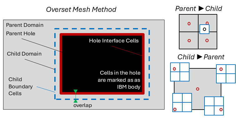Overset mesh (also known as grid nesting) allows to introduce refinement levels within TOSCA. In this technique, a finer mesh is immersed inside the original background mesh. Boundary conditions for the finer mesh are interpolated from the background mesh, while cells in the background mesh are blanked when they overlap with the finer mesh. This “hole” in the background mesh is treated as an IBM body (see IBM), where the solution at the IBM fluid cells is interpolated from the finer mesh. In order to understand how the overset mesh method works in TOSCA, it is worth mentioning some nomenclature used in relation to the following figure: