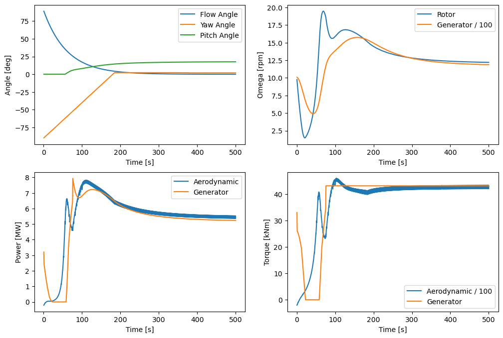 Interstingly, the controller switches off the wind turbine for a few seconds, during the transition phase. As designed, the controller drives the wind turbine to face the wind direction, while the pitch controller adjusts the pitch angle to protect the wind turbine above rated conditions, while the power output adjusts to 5 MW.